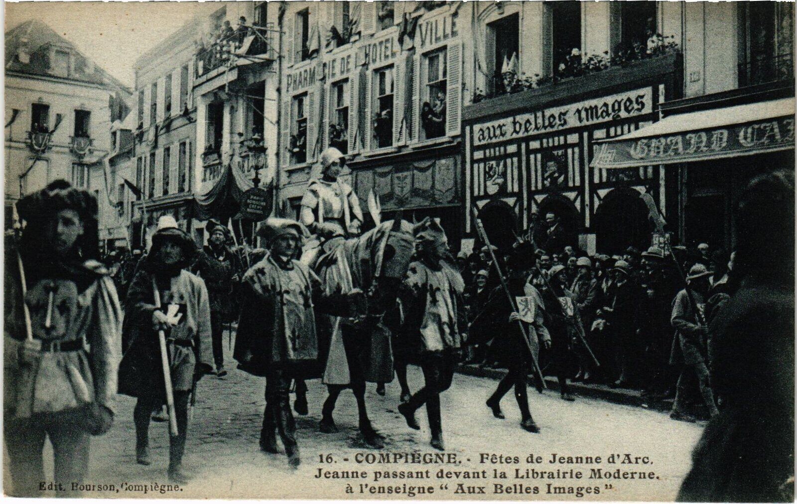 Version 3 : 16. CO MPIEGNE. Fêtes de Jeanne d'Irc. Jeanne passant devant la Librairie Moderne Luat Bou:Bon Compiègne. 4 fenseigne Aux Belles Images uiages belles aur
