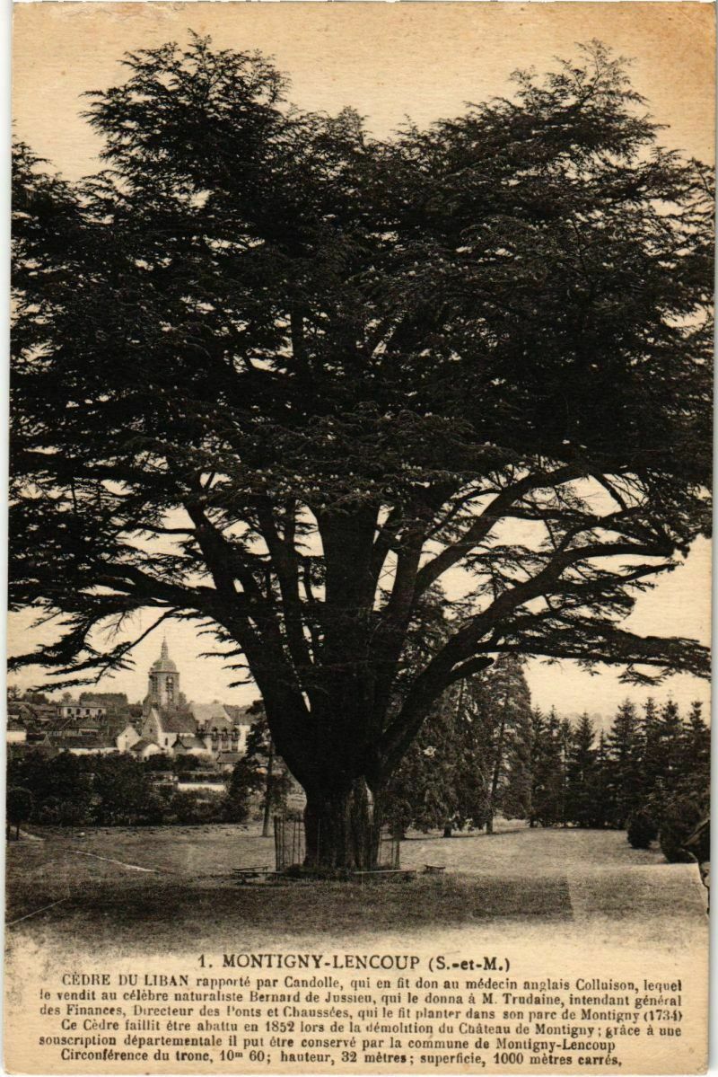 Version 1 : _ 1. Montigny-Lencoup (S.-et-M.) CEDRE DU LIBAN rapporté par Candolle, qui en fit don au médecin anglais Colluisan, lequ ! le sendit au célèbre naturaliste Bernard de Jussien, qui le donva a M lrudaine, intendant général des Finances Directeur ds Ponts et Chaussées, qui De fit planter dans son pare de Montions (174) Ce Cédre faillit ére abattu en 1852 lors de la dém lon du Chât-au de Monteeny ; grace a un: souscription départementale 11 puit être conse1v$ par la commun- de Moctpuy-Lencoup Circonference du tronc, 1060 ; bauteur, 32 uiètres , supertuie, 11MW uiclics Cannes.
