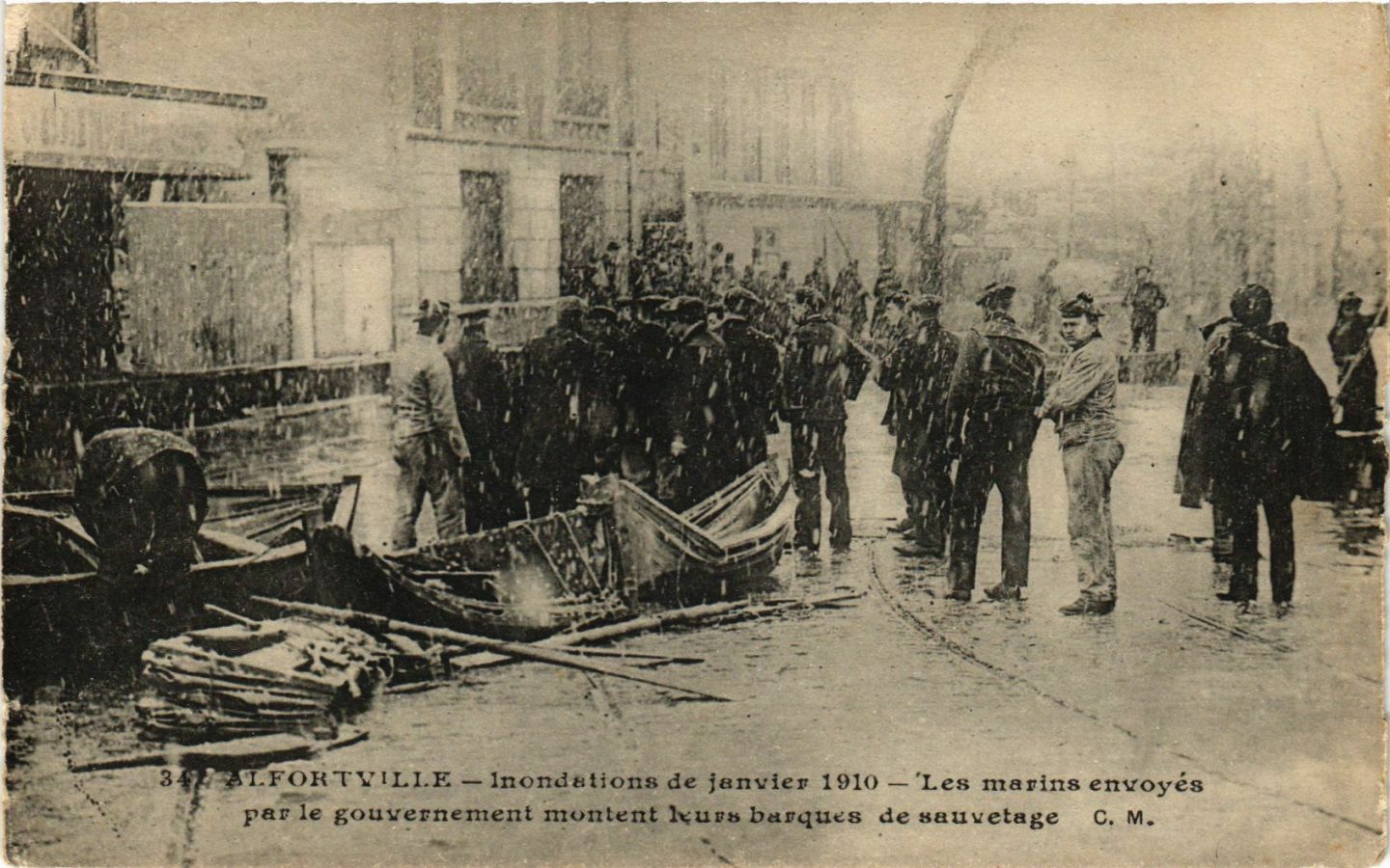 Version 3 : LFOKTVILLE Inondutions de jenvier 1910 'Les marin8 envoyés Par le gouvernement monlent Jxurs barques de sauvetage C. M.