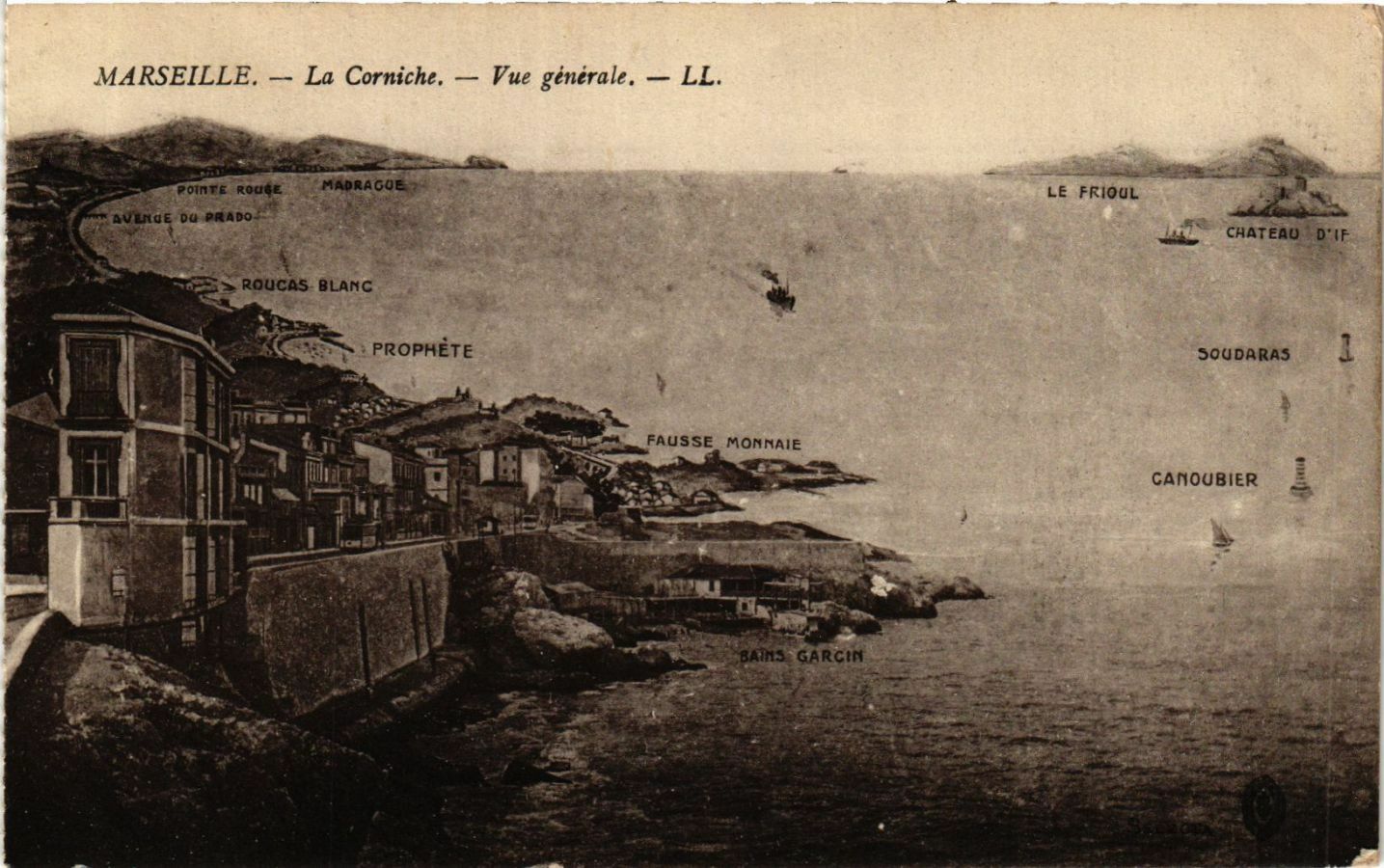Version 1 : MARSEILLE. —- La Corniche. — Vue générale, — LL. - LE FRIQUL LA SOUDARAS + + FE aan a ER Real 1 FAUSSE MONNAIE 5 A A , … 5 CANOUBIER