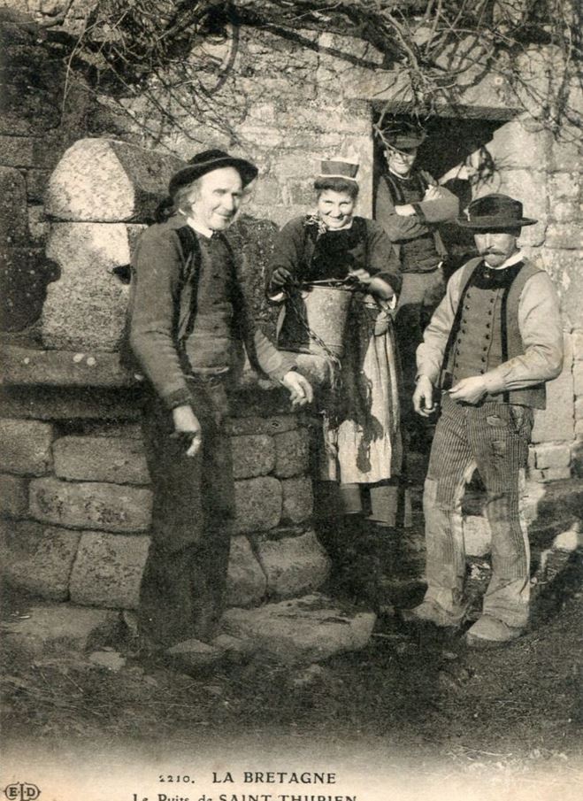 habitants en costume traditionnel posant près d'un vieux puits à Saint-Thurien au début du XXe siècle (Finistère)