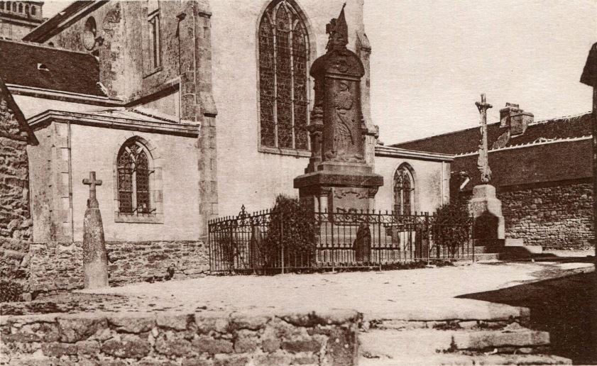 Le monument au morts de Saint-Thurien, le calvaire et la stèle christianisée dite du Père Maunoir situés près de l'église (carte postale ancienne)