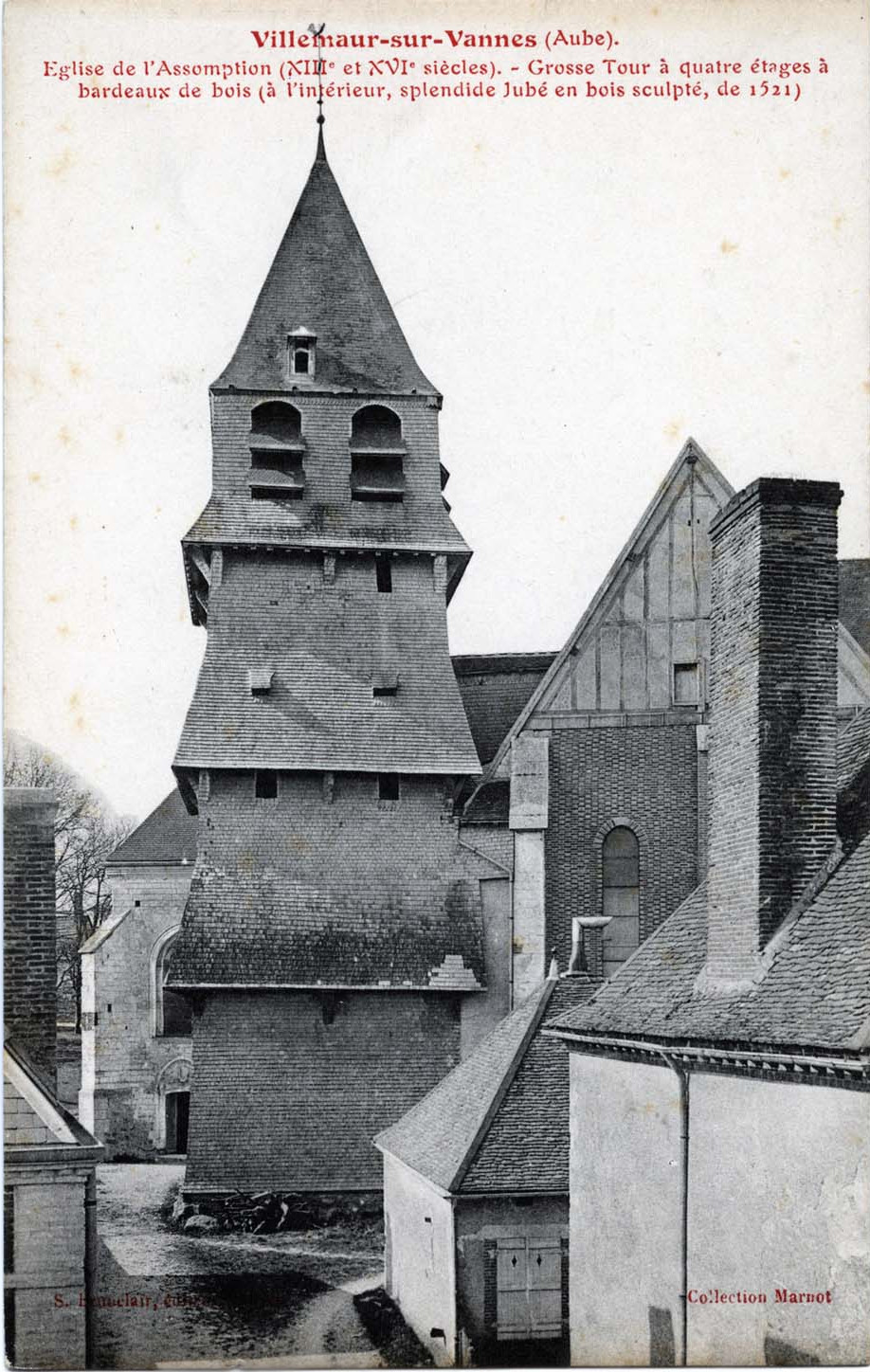 Version 3 : Villekaur-sur-Vannes (Aube). Eglise de 1'Assomption et XVI siècles) Grosse Tour à quatre étages bardeaux de bois Tintérieur, splendide Jubé en bois sculpté, de 1521) Co-lection Marnot (XIII