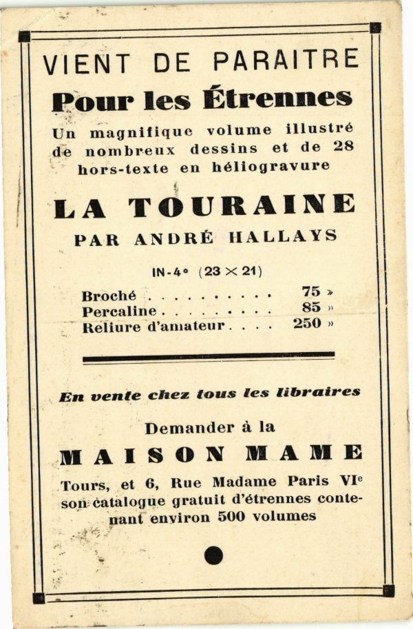 Version 2 : VIENT DE PARAITRE Pour les Etrennes Un magnifique volume illustré de nombreux dessins et de 28 hors-texte en héliogravure LA TOURAINE PAR ANDRE HALLAYS IN-4° (23 21) Broché .....+. +» 75 Percaline. . ...++.- 85» Reliure d'amateur. ... 250» En vente chez tous les libraires Demander à la MAISON MAME Tours, et 6, Rue Madame Paris VI° son-éatalogue gratuit d'étrennes conte- nant environ 500 volumes