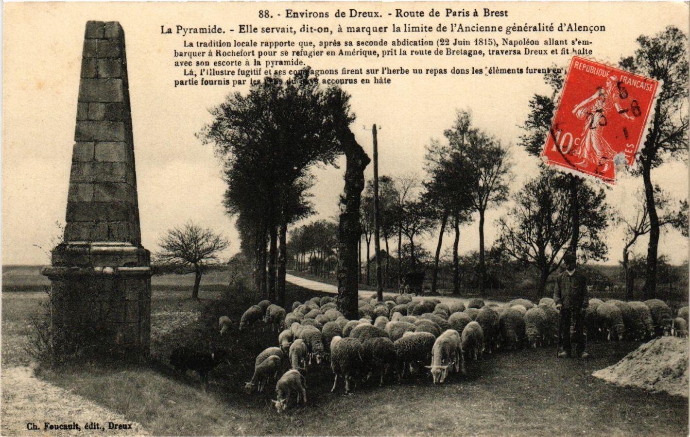 La tradition locale rapporte que, après sa seconde abdication (22 Juin 1815) Napoléon allant s'embarquer à Rochefort pour se réfugier en Amérique, prit la route de Bretagne, traversa Dreux et fit halte avec son escorte à la pyramide. Là, l'Illustre fugitif et ses compagnons firent sur l'herbe un repas dont les éléments furent en grande, La partie fournis par les gens du pays accourus en hâte.