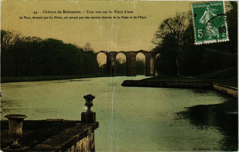 Version 1 : 44. - Château de Maintenon. - Une vue sur la Pièce d'eau Le Paic, dessiné par Le Nôlre, est arrosé par des canaux dénisés de la Voise et de l'Eure