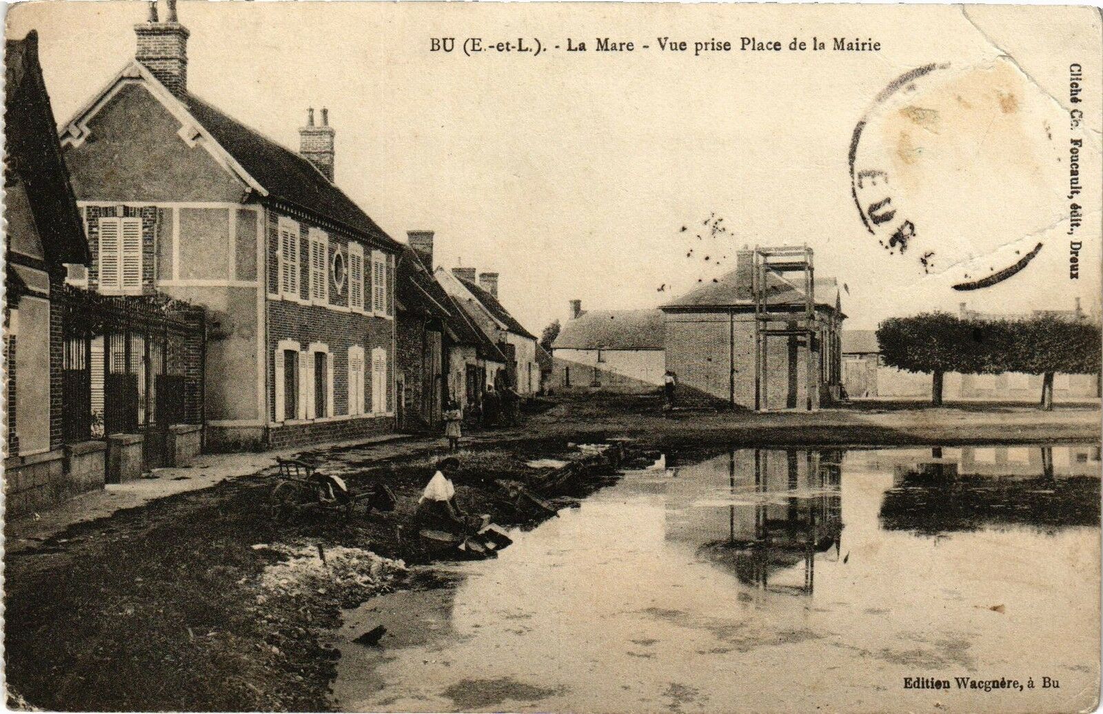 Version 2 : Cliché C&, Foucault, édit, Dreux BU (E.-et-L.). - La Mare - Vue prise Place de la Mairie Edition Wacgnère, à Bu —