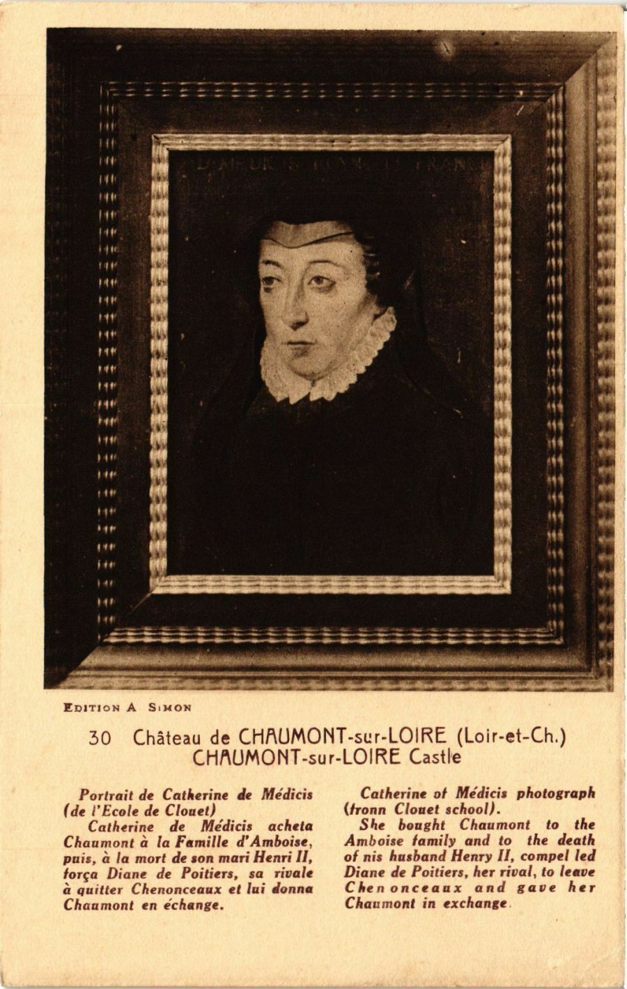 Version 2 : EDITION A SIMON 30 Château de CHAUMONT-sur-LOIRE (Loir-et-Ch.) CHAUMONT-sur-LOIRE Castle Portrait de Catherine de Médicis (de l'Ecole de Clouet) Catherine de Médicis acheta Chaumont à la Famille d'Amboise, puis, à la mort de son mari Henri II, força Diane de Poitiers, sa rivale à quitter Chenonceaux et lui donna Chaumont en échange. Catherine of Médicis photograph (fronn Clouet school). She bonght Chaumont to the Amboise family and to the death of nis husband Henry II, compel led Diane de Poitiers, her rival, to leave Chenonceaux and gave her Chaumont in exchange