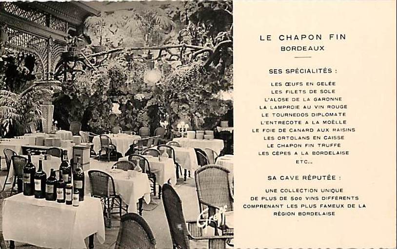 Version 1 : LE CHAPON FIN BORDEAUX SES SPECIALITES : LES OeUFS EN GELEE LES FILETS DE SOLE L'ALOSE OF LA GARONNE LA LAMPROIE AU VIN ROUGE LE TOURNEDOS DIPLOMaATF L'ENTRECOTE A LA VOCLLE LE FOIE DE CANARD AUX HAISINS LES ORTOLAMS EN CAISSE LE CHAPOM FIV TRUFFE LES CEPES A LA BORDELAISE ETC... SA CAVE REPUTEE - UNE COLLECTION UNIQUE DE PLUS DE 500 VINS OIFFERENTS COMPRENANT LES PLUS FAMEUX OE LA REGION BORDELAISE