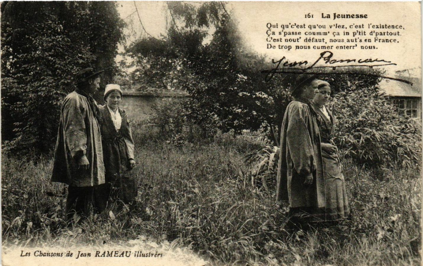 Version 2 : Les Chansons de Jean RAME AU illustrées 161 La Jeunesse st qu'ou v'lez, c'est l'existence, © coumm' ça in p'tit d'partout C'est nout défaut, nous aut's en France, De trop nous eumer enterr' nous.