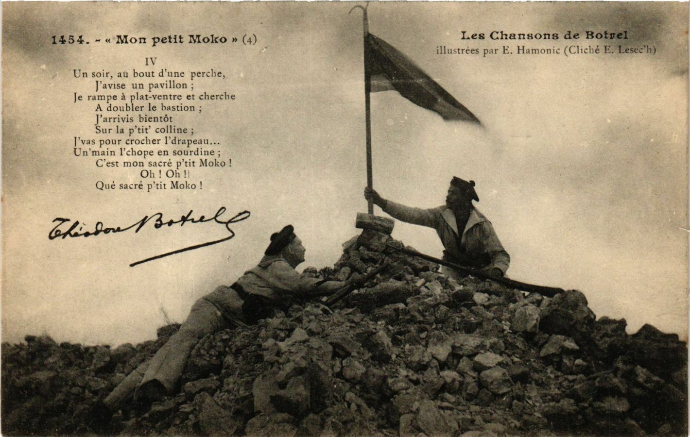 Version 3 : 1454 Mon Moko Les Chansons de Botrel illustrées Par E. Hamonic (Cliché E. Lesec'h) IV Un soir, au bout dune perche, Javise un pavillon Je rampe à plat-ventre et cherche A doubler le bastion Jarrivis bientôt Sur la p'tit colline vas pour crocher ldrapeau. Un 'main Ichope en sourdine Cest mon sacré p'tit Moko Oh Oh Qué sacré p'tit Moko petit