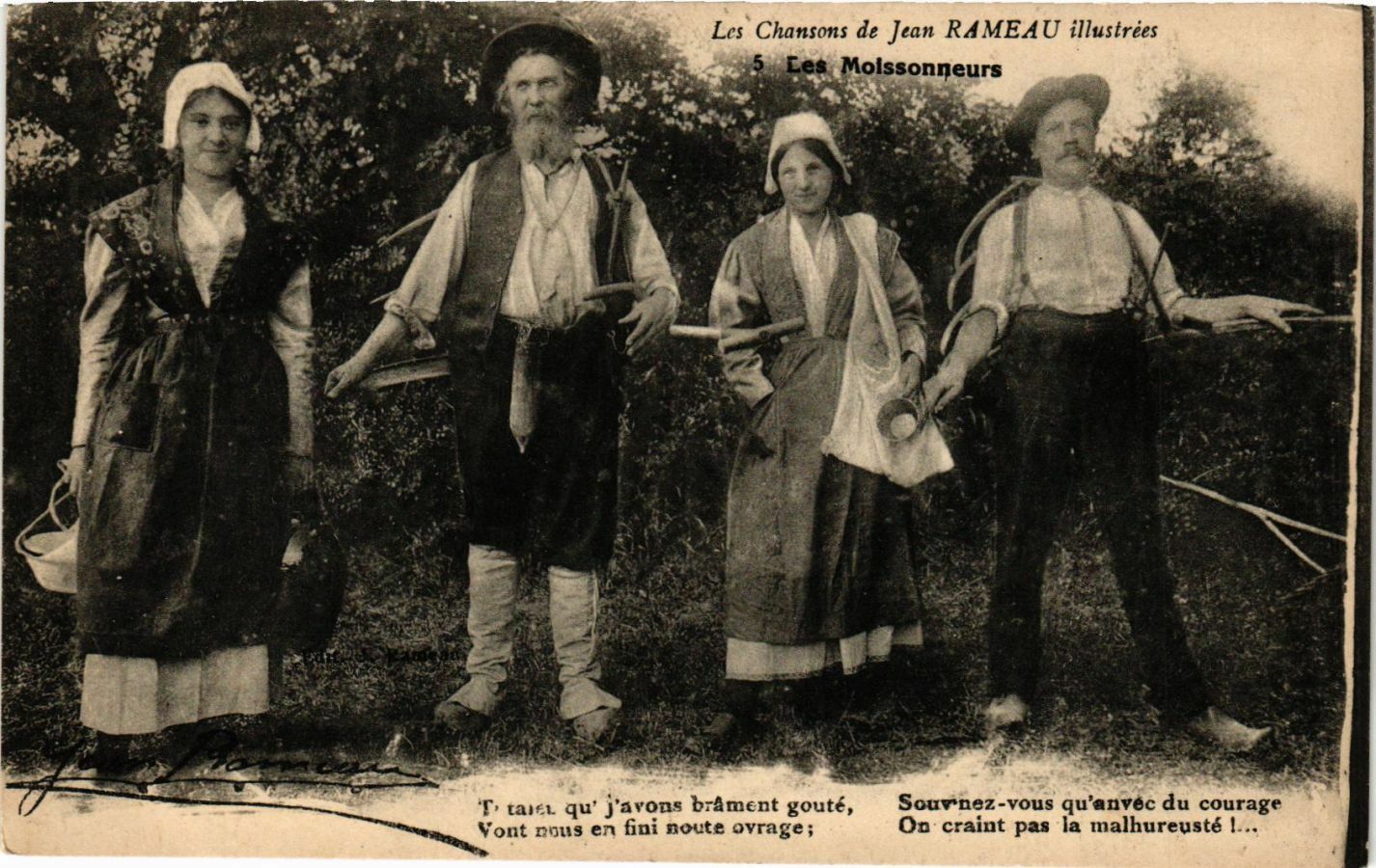 Version 3 : Les Chansons de Jean RAMEAU illustrées Les Moissonneurs A présent qu'jon brament goûté Mes enfants, anvec du courage Allons n' en fini nout'ouvrage On craint pas la malheureuseté ! 'ou'
