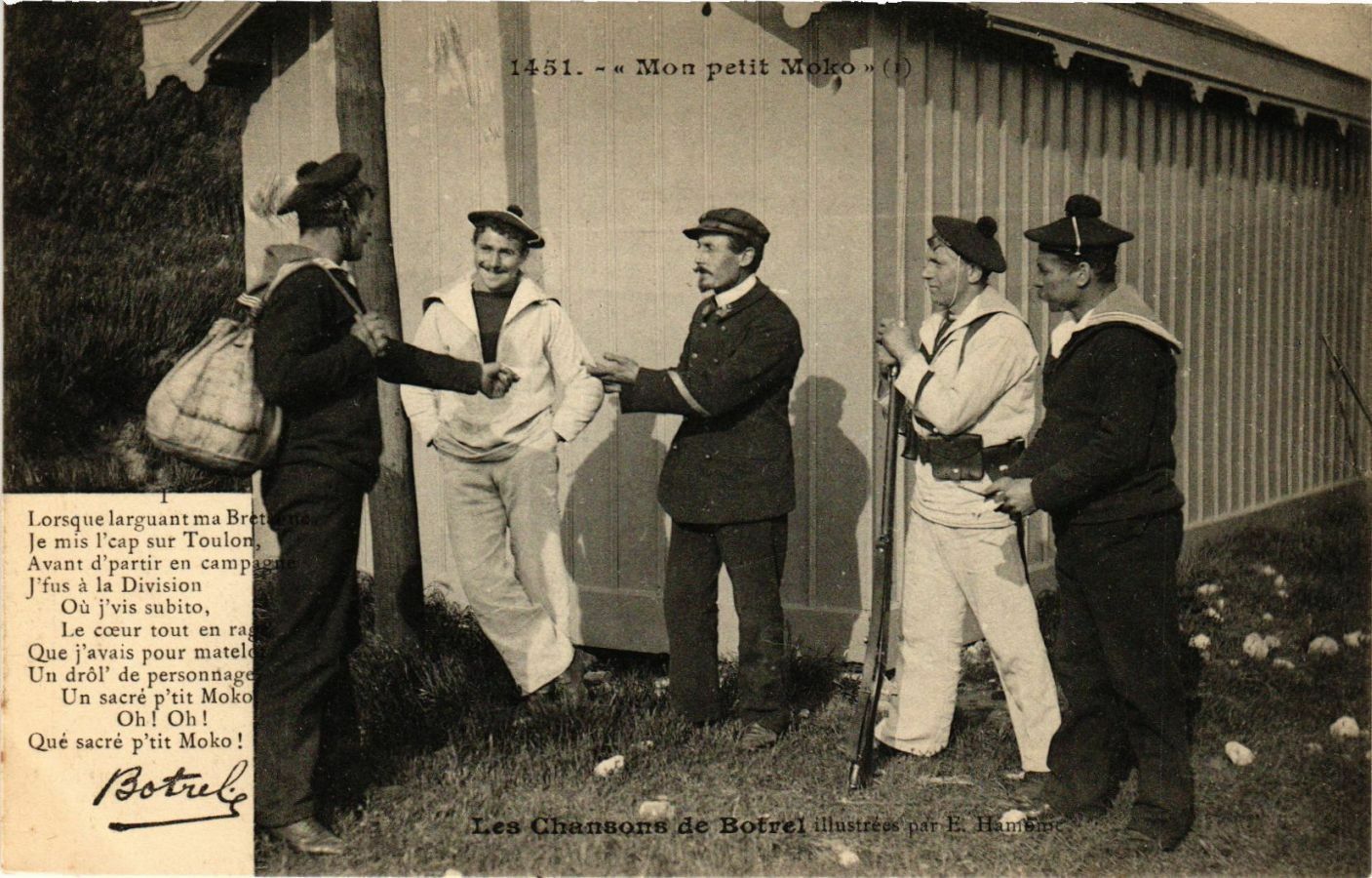 Version 3 : 1451 Mon petit Moko Lorsque larguant ma Brft Je sur Toulon Avant dpartir en camp à la Division Où jvis subito, coeur tout en ra Que javais pour matel Un drôl de personnag Un sacré p'tit Moko Oh Oh Qué sacré p'tit Moko Roti Les Chanbons de Botrel ilustrees mis Fcap Jfus Le par