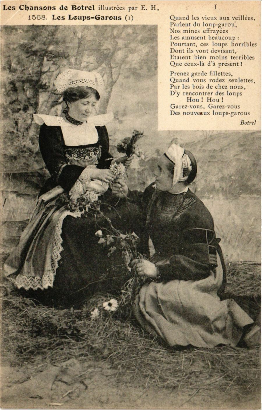 Version 1 : Les Chansons de Botrel illustrées par E. H, 1563. Les Loups-Garous (1) [ Quaerd les Vieux aux veillees, Parlent du loup-rarou, Nos mines cffravees Les amusent beaucoup : Pourtant, ces loups horribles Dont ils vont devisant, ltarent bien moins terribles Que ceux-là d'à present ! Prenes varde hllettes, Quand vous rodez seulettes, Par les bois de chez nous, D'y rencontrer des loups Hou! Hou! Garez vous, Garez-vous Des nouveaux loups-garous Botrel
