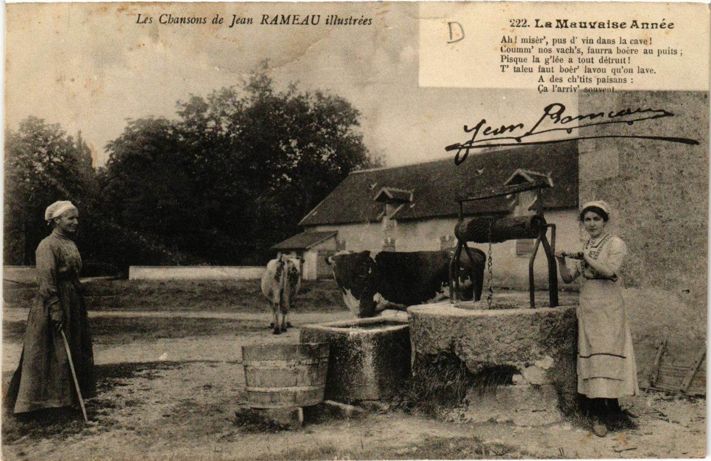 Version 1 : Les Chansons de Jean RAMEAU illustrées. 222. - La Mauvaise Année. Ah! miser. pus d' vin dans la cave ! C umim' nos vach's, faurra bouére au puits Pisque la #'iée a tout détruit : T' Taleu faut bouér' iavou qu'on l'ave. A des ch'tits paisans Ca l'urriv souvent.