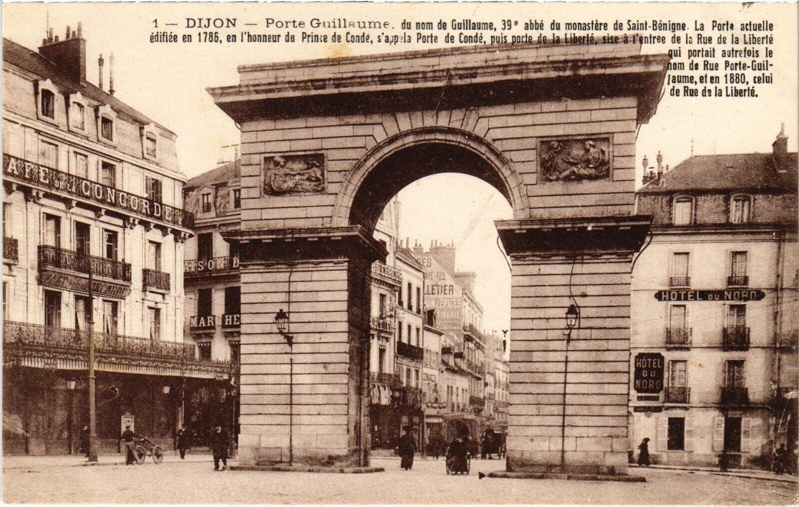 Version 3 : 15 DIJON Porte Guillaume, du pom de Guillaume, 39e abbé da_monastère de Saint-Bénigne.4a porte actuelle édifiée 1786, en ['honneur du prince de Condé, 'enttée_de_la Rue de la Liberté portait aulrefois Je Dom de Rue Porle-Gpil Jaume; et en 1830, celui de Rue de la Liberté S0 EtiER MAR HE Hotel ord R I Dépose qui