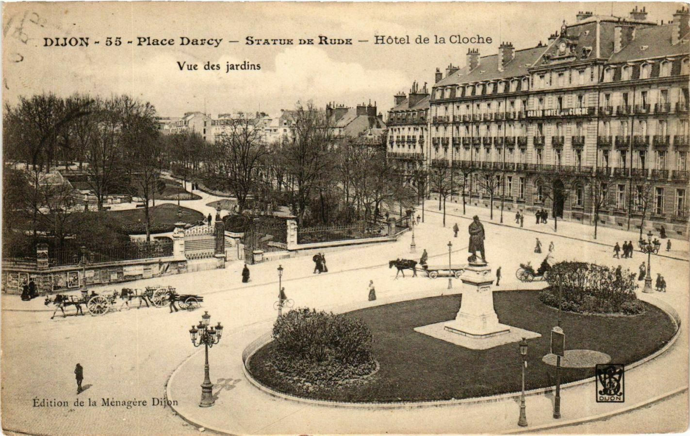 Version 3 : DIJON 55 Place Darcy STATUE DE RupE Hôtel de la Cloche Vue des jardins Edition de la Ménagère Dijon