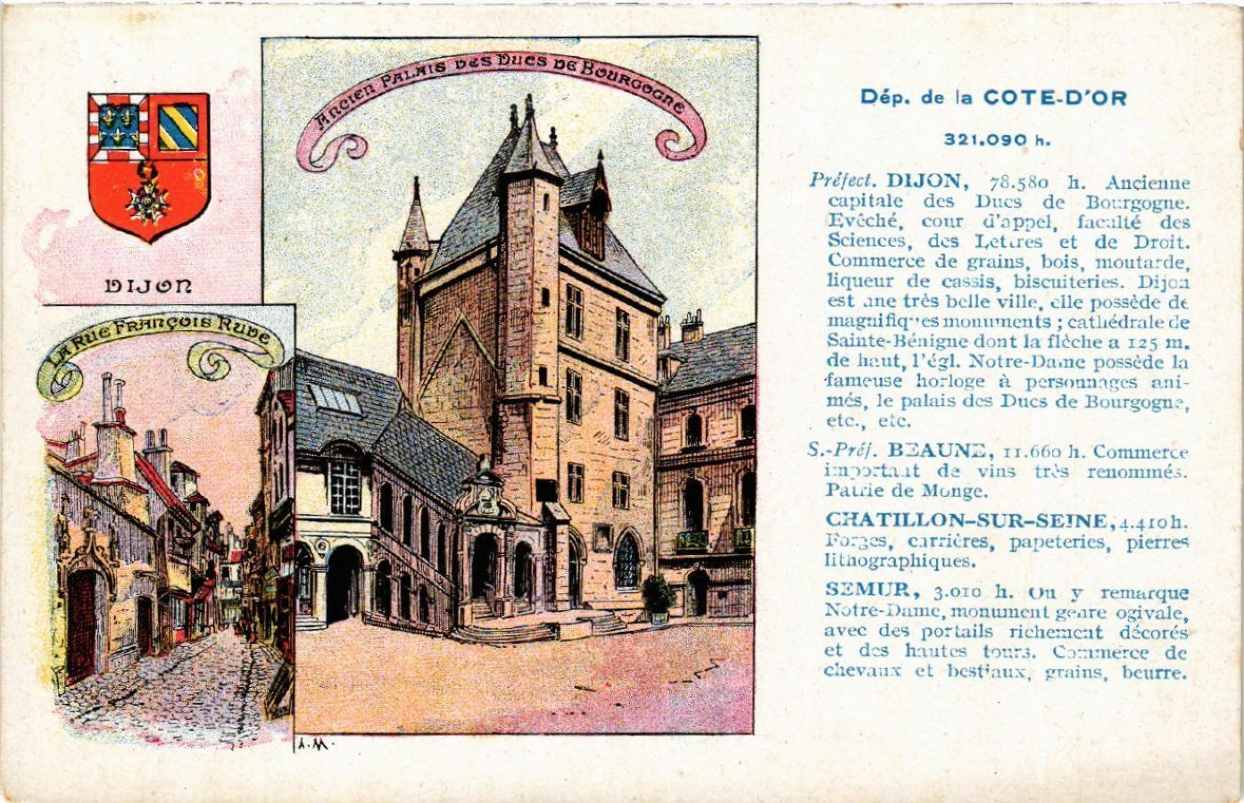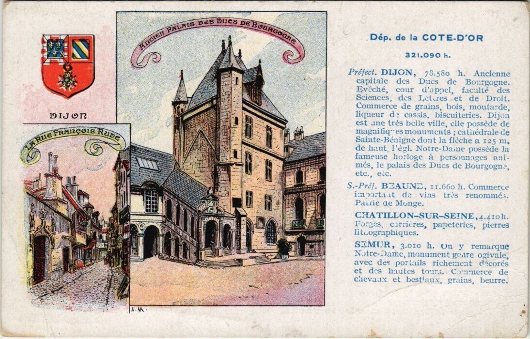 Version 1 : J Dép. de la COTE-D'OR 321.090 h. ; DIJON, 22000 He Aude nr « Cutole des Prius de Boum L vole, vont Gippel Hacntie dd - Scicnves, dus Iotites et de Piroit. Commerce de cran , bois, me utoode Heueur de Cas-is, biscuiteries, Dig ct ane très belle vle, cie possède de Mazaifi quesmronanietnts scathédr.tede Sonate Renicne desit La flecle a + Tu de is 1, lu 1, Nate une ] fameercse hoilous it pe rremn es 20 pres, le naluis de Da - de Bon Ve, Cie F5, BEAUNS, 1108 1. Conmmmiere« Pdoclnal de vins trs renonint Pause GC Monye. CHA TILLON-SU R-SFNE, Qu. SOI 105,0 Miierez, parceteries, pie TTu= cure ioniques, SEMUR, 3010 1, On v remerque Scotre Dane, mmesneinent voire civile avec des portails richenent décore ets dieitos ter 1 Cornmierer du ' PRES AS SL nest ne, rats, Seurre