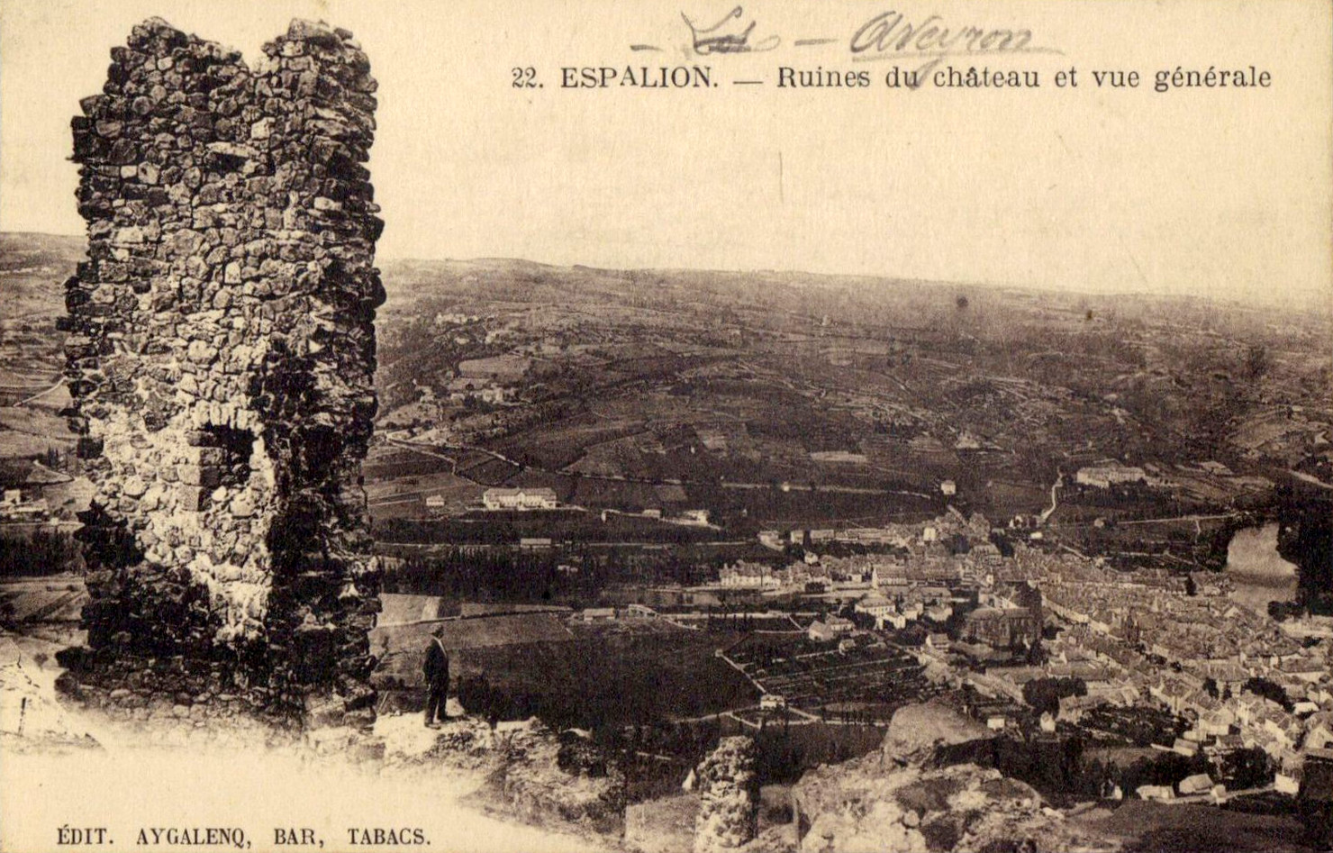 Version 2 : — rl C 22. ESPALION. — Ruines dw château et vue générale AYGALENQ, BAR, TABACS.