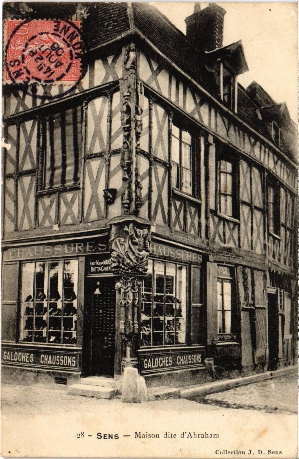 Version 2 : “Collection JD. Seur_ SENS — Maison dite d'Abraham Ce te ancienne maison en bois sculpté, se trouve à l'angie formé par les vues d * la épais et Jean d'une énorme piece de bois, offre de curiens. sis y a Sans togies Lee pibtas de