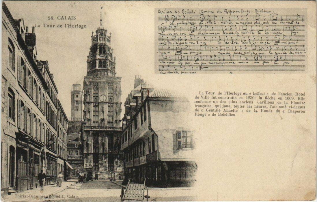 Version 3 : Caullem Cains: 14. CALAIS Tour de PHorloge La Tour FHorloge belroi de Pancien Hutel de Villc fut constrnite 280 Ileche Lllc reuferme des plus auciens Carillons la Flandrc Irançaise qui ioue, loutes heures air note C1-dessus Gentille Annetle Fondc Chaperon Rouge de Boieldieu . Hegumne