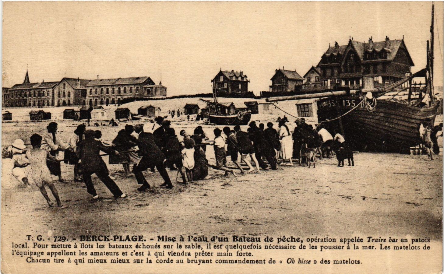 Version 1 : 729. - BERCK-PLAGE. - Mise à l'eau d'un Bateau de pêche, opération appelée Traire l'as en patois local. Pour Les matelots de l'équipage mettre à flot les bateaux échoués sur le sable, 1l est quelquefois nécessaire de les pousser à la mer. + appellent les amateurs et c'est à qui viendra prêter main-forie. Chacun tire à qui mieax mieux sur la corde au bruyant comma Je. npdement de « Oh bisse » des matelo:s.