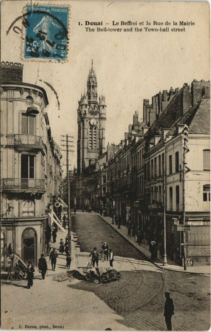 Version 2 : 1. Douai — Le Beffroi et la Rue de la Mairie The Bell-tower and the Town-hall street te. Baron, phot., Douai