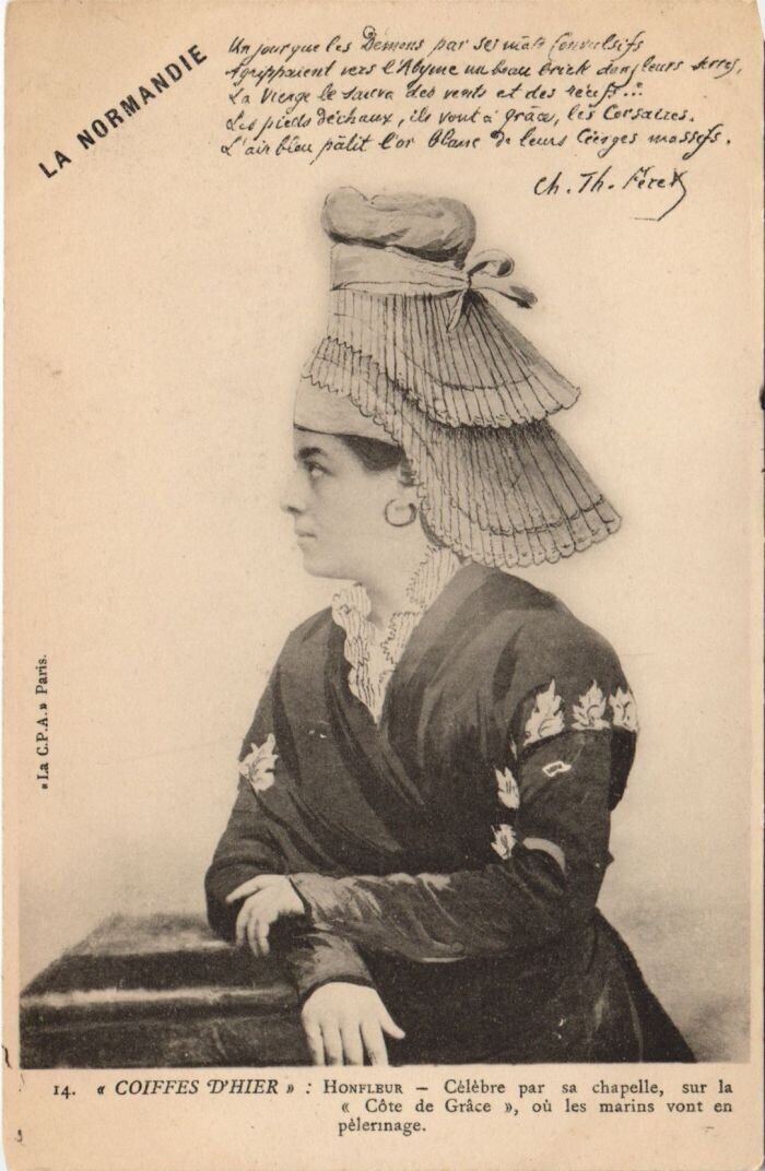 Version 2 : XL t. Coiffes d'autrefois - HONFLEUR (Calvados) Célèbre par ses pèlerinages à la Chapelle de la « Côte de (srâce » Patrie du peintre Daguerre et des marins Binot-Paulmier, Doublet, Boitard, Hamelin, etc,