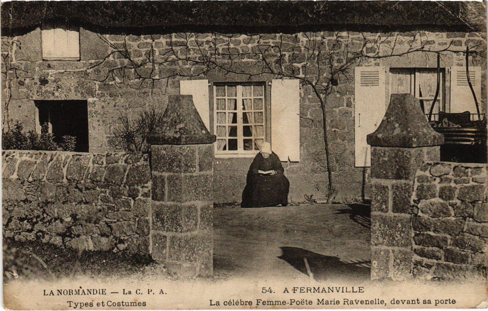 Version 3 : LA NORMANDIE La €. 1. A. 54 . A FERMANVILLE T.pes et Costumes La célebre Femme-Poëte Marie Ravenelle, devant sa porte