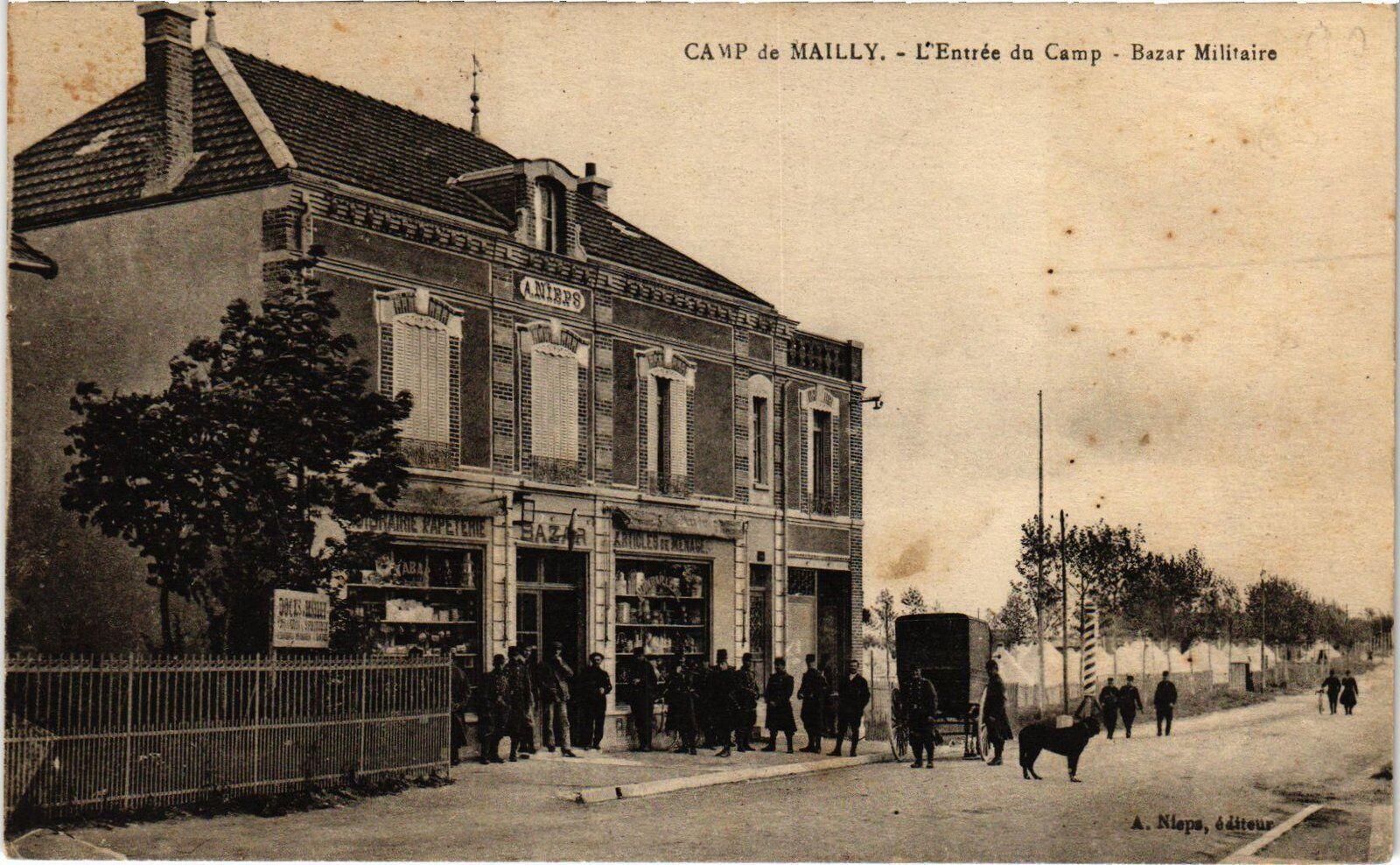 Version 1 : CAMP de MAILLY. — L'Entrée du Camp. - Bazar Militaire. = a. M 4 1 TA A.Niepi, édifeur “7