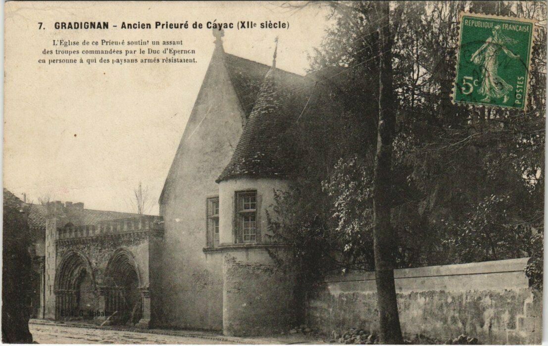 Version 1 : 7. GRADIGNAN - Ancien Prieuré de Cayac (XIIe siècle) L'Exlise de re Prieuré soutin® un assaut des troupes commandées par le Due d'Epernon eu personne à qui des paysans armés résistatent.