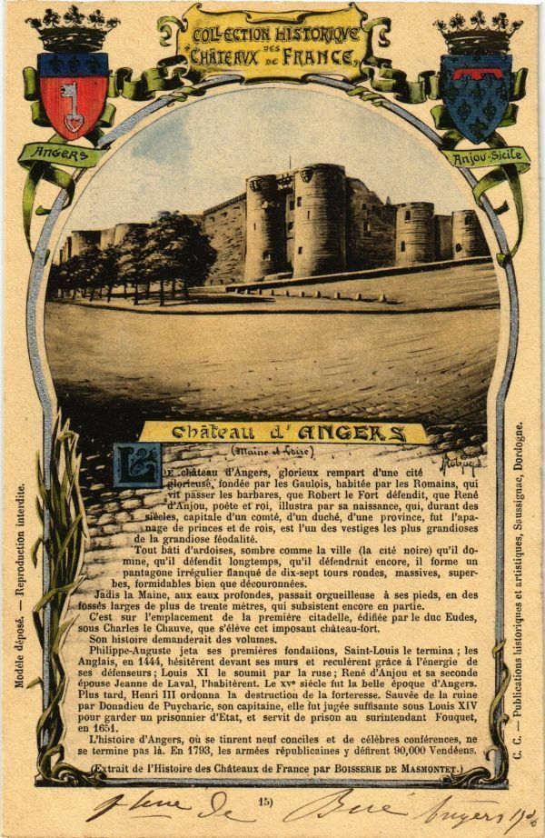 Version 3 : COLLCCTION HISTORiQVC CHATeRVX FRANCC; AnveRs Anjou Sidle cbateaul 4GIGEKS (anaine Soue) 1 chateau d'Angers, 'glorieux rempart dunc cité Bloricuse iondée par les Gaulois, habitée par les Romaing, Yit passer les barbares Robert le Fort déiendit , Rene 1 dAujou, el roi, illustra par nhisyance qui, durant des siecles, capitale dun comte, dun duche, dune province Papa- nage de princes de rois; est luu des vestiges les plus grandioses ieodalité. Tout grüundiosa durdoises sombre coimne ville cite noire) quil do- 1 Mle qu'i défendit longtemps quil defendrait encore; orme pantagone irrégulier flanqué dix-sept tours rondes Mossies super- formidables bien que découronnées- Jadis Maine, proiondes passait Orgueilleuse pieds, des fosses larges de plus de trente métres qui subsistent encore partie Templacement premierc citadelle, édifee par le duc Eudes, 1 sous Charles Chauve que s'léve cet imposanl chaleau-lort. 1 Son hisloire demanderait des Yoluines Philippe-A uuste eta premiéres fondalions Saint-Louis le termina Anglais 1444, hésiterenl devant ses murs reculerent 'açou ésergio 1 défcnseurs Louis goumn la ruse René seconde épouse Jeanne de Laval, Thabitérent. Le Xve siecle iut lu belle époque dAngers, 1 Plus tard , Heuri III ordonna destruction de a orteresse auvee de lu ruine par Donadieu de Puycharic, son capitaine elle iut jugée suffisante sous Louis XIV Dour prisonnier dEtat, servit de prison au sunutcudaul Fouquet, Iegarder Lhistoire dAngers, tinrent neuf conciles de célebres conlérences termine pns la En 1793, les armfes républicaines défirent 90,000 endeens, strait de lHistoire des Chateaux de France par BolssERIE DE MASMONTETJ 6248217 1 que que pocte Cest pur