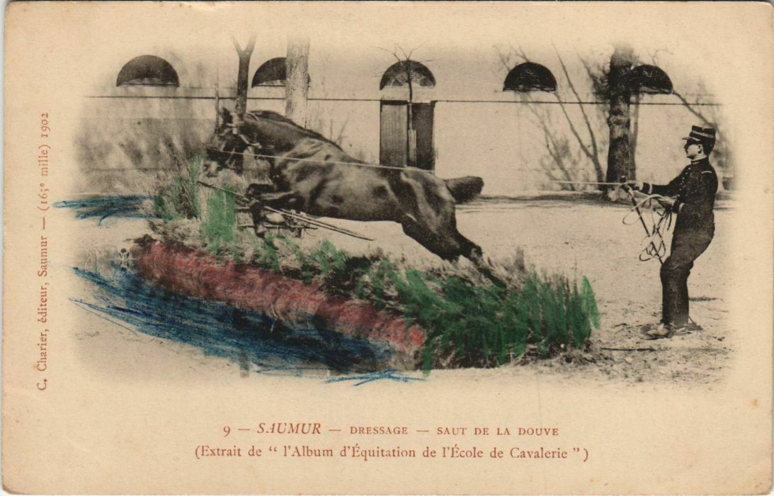 Version 2 : Ile) 1902 de mi harier, éditeur, Saumur — (16 C. € 9 — SAUMUR — DRESSAGE — SAUT DE LA DOUVE (Extrait de ““ l'Album'd'Equitation de l'Ecole de Cavalerie )