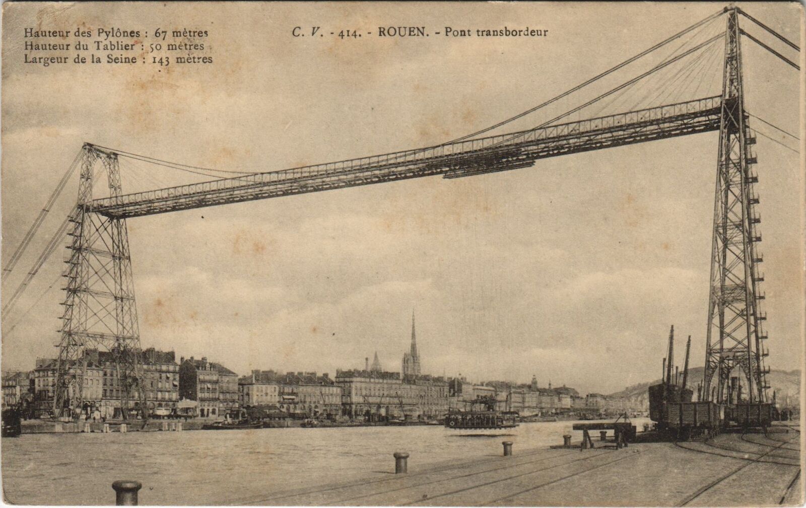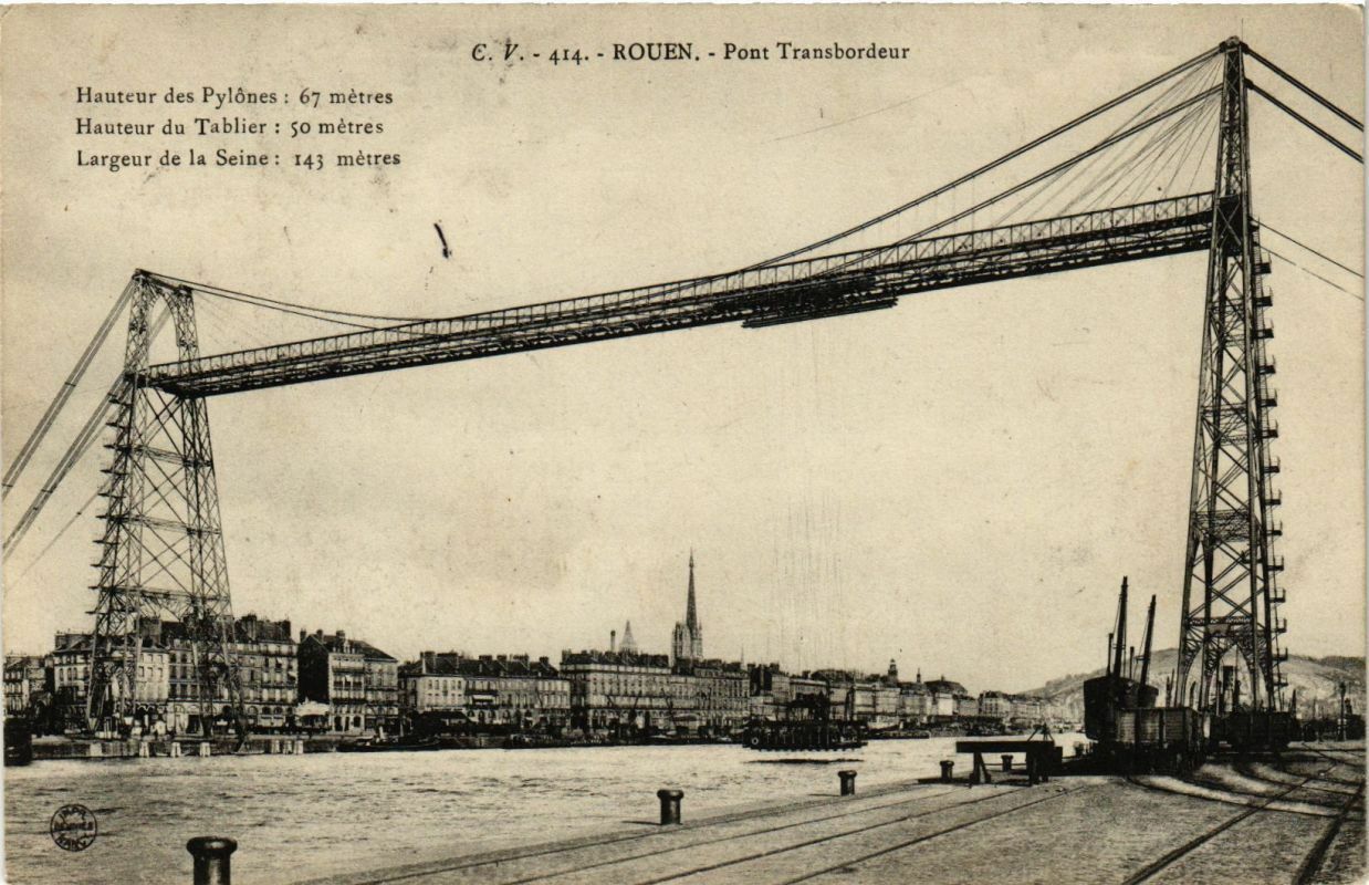 Version 3 : Hauteur des Fylônes 67 mètres C V. 414. ROUEN. Pont Transbordeur Hauteur du Tablier 50 mètres Largeur 'de la Seine 143 nètres shisoa lu 01 il 36 39