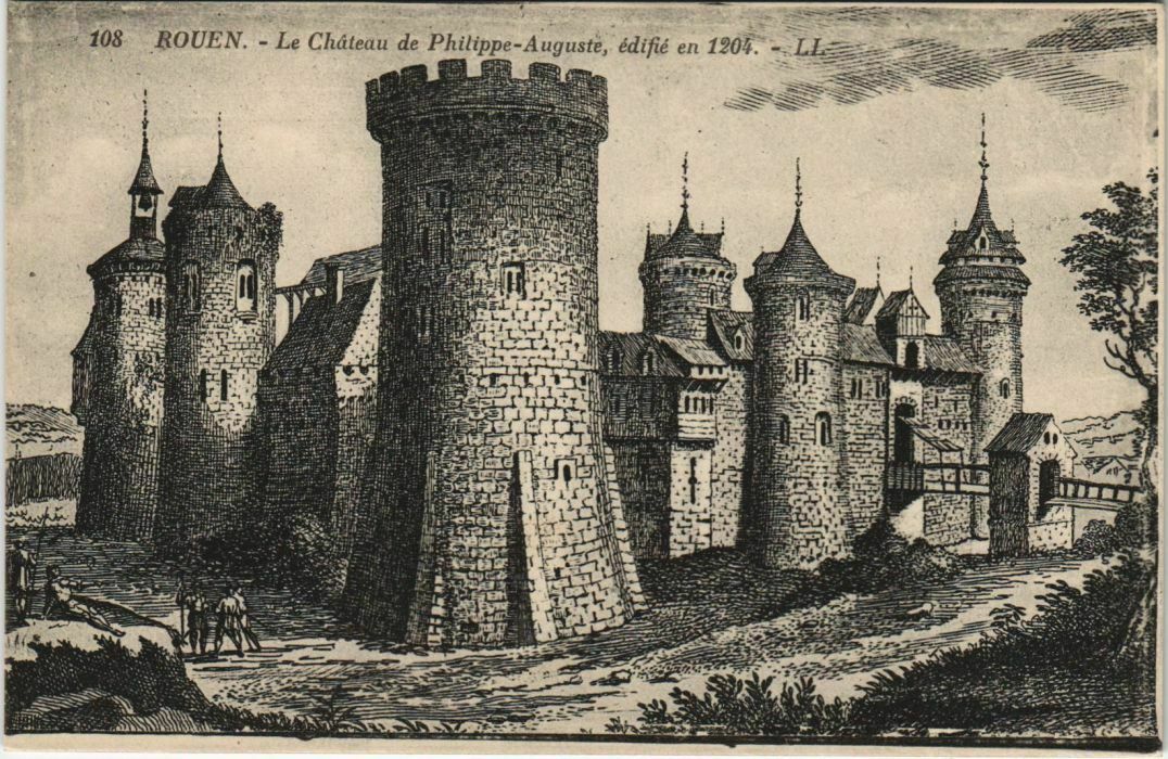 Version 1 : QAR ER LA :— 199. - ROUEN. - Tour où Jeanne d'Arc fut enfermée en 1431 et Ancien Château bâti par Philippm-Augquste en ‘204 ALI Détruit en 1809 jus + 1 à FRAN oe h L 2 4 +