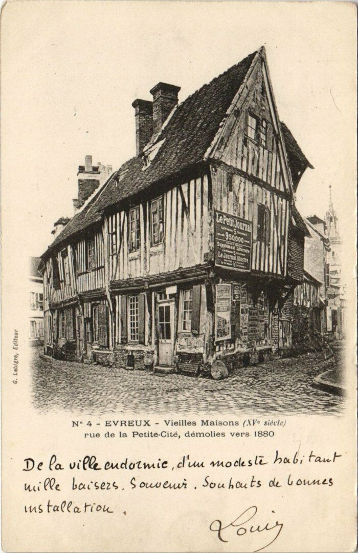 Version 1 : G. Leuigre, Eciteur PR ce OU La CE STI 4 me = : PES see - cou N° 4 - EVREUX - Vieilles Maisons (AVs siecle. rue de la Petite-Cité, démolies vers 1880 De Da vif eudutmie , cl'uu mocleslt ba bi faut ui lle bacsezs, Souveui . Sou hou Es de L ounes 0 - toy vus taléaFiou .