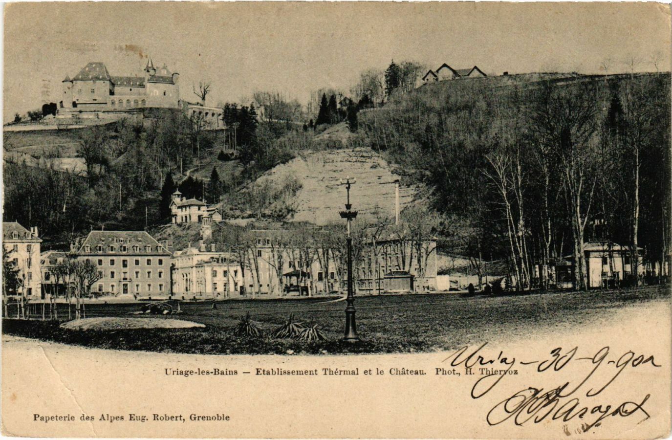 Version 3 : ~8 Uriage-les-Bains Etablissement Thérmal et le Chûteau. IL Thieryoz Papeterie des Alpes Eug. Robert, Grenoble Phot ,