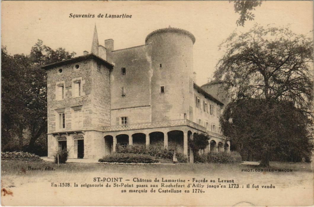 Version 1 : Sçuvenirs de Lamartine vi ST-POINT — Château de Lamartine - Façade au Levant - En 1528. la seigneurie de St-Point passa aux Rochefort d'Ailly jusqu'en 1773 : il fut vendu LR au marquis de Castellane en 1776. ; #