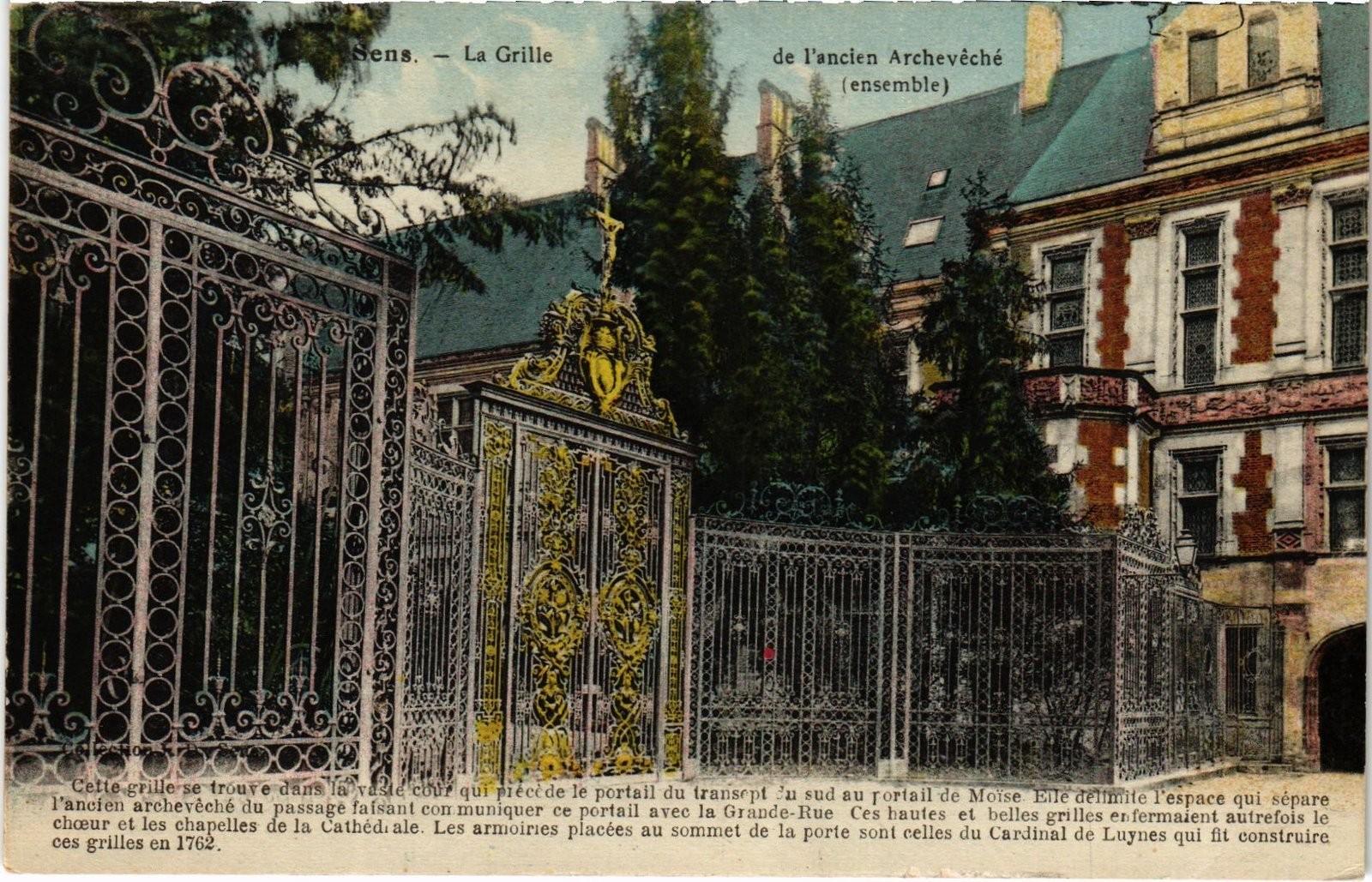 Version 3 : SENS La Grille Yancien Archeuéchè 'nscmble) Cette glille 80 tronve dans couf qul précede le portull du 'ranaept du eud au pcrtail de Moiee Elle dellmlte Tespace q0l separe Vanclen arch Fêche Pasbogelalsant commuplyuer ce portall ayec la Graude-lue Ces bauteb @6 belles Krlleg enfermatent autrelois lo choeur @t les chapelies de la Catnedrale. Les armoirie# placeer au rommet de la porte sont celles du cardinal a0 1es ft construlre 0c8 grllles en 1762 Luy qul