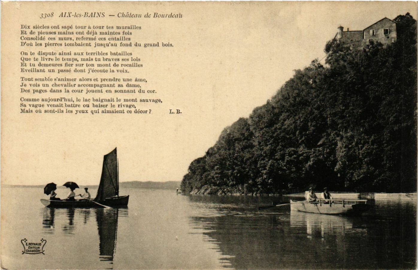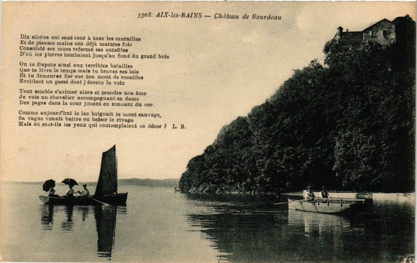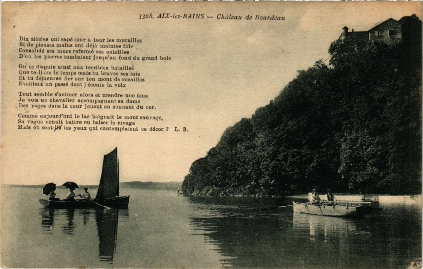 Version 1 : » ° 3 $. 3308. AIX-les-BAINS. — Château de Bourdeau …. + - “. F3 4 Dix siècles ont sapé tour à tour les murailles Et d# pieuses mains ont déjà maintes fois Consolidé scs murs ref-rmé ses entailles D'où les pierres tombaient jusqu'au fond du grand bois. On te dispute ainsi aux terribles batailles Que te Itvre le tempe mais tu braves ses lois Et tu demeures filer sur ton mont de rocailles Eveillant un passé dont j'écoute la voix. Tout semble s'animer alors ct prendre une âme Je vois un chevalier accompegnant sa dame Des pages dans la cour jouent en sonn nt du cor. Commo aujourd'hui le lae haignait le mont swvuvage, Sa vague venait battre ou' baiser le rivage Mais où sont-ils les yeux qui contemplaient ce décor ? L. B.
