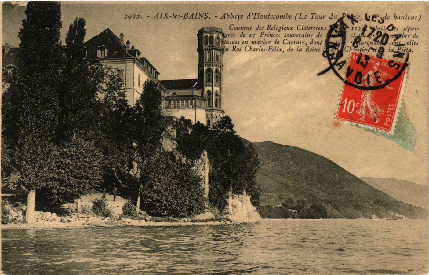 Version 1 : 2922. - Abbaye d'HAUTECOMBE Couvent des Religieux Césterciens depuis 1125, abrite les sépultures de 27 Princes souverains de Savois et un grand vombre de statues en marbre de Carrare, dont les plus remar- qu'ibles sont celles du Roi Charles-Fétix, de la Reine Marie- Chicine et de la Piéta.