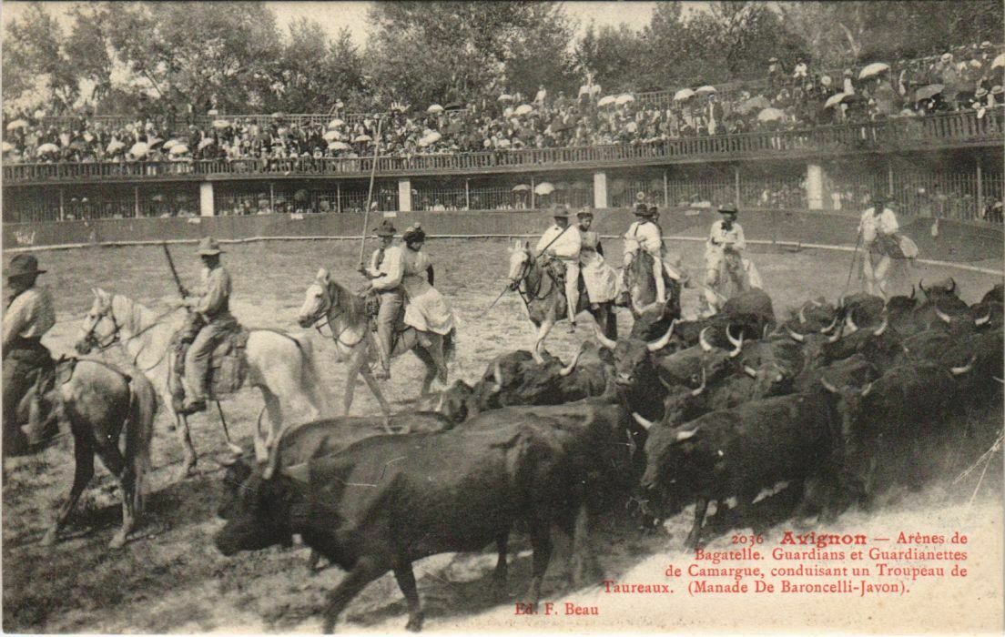 Version 3 : 2036 Avignon Arenes de Bagatelle. Guardians et Guardianettes de Caanarga$ conduisant un Troupeau de Taureaux De Baroncelli-Javon) Beau