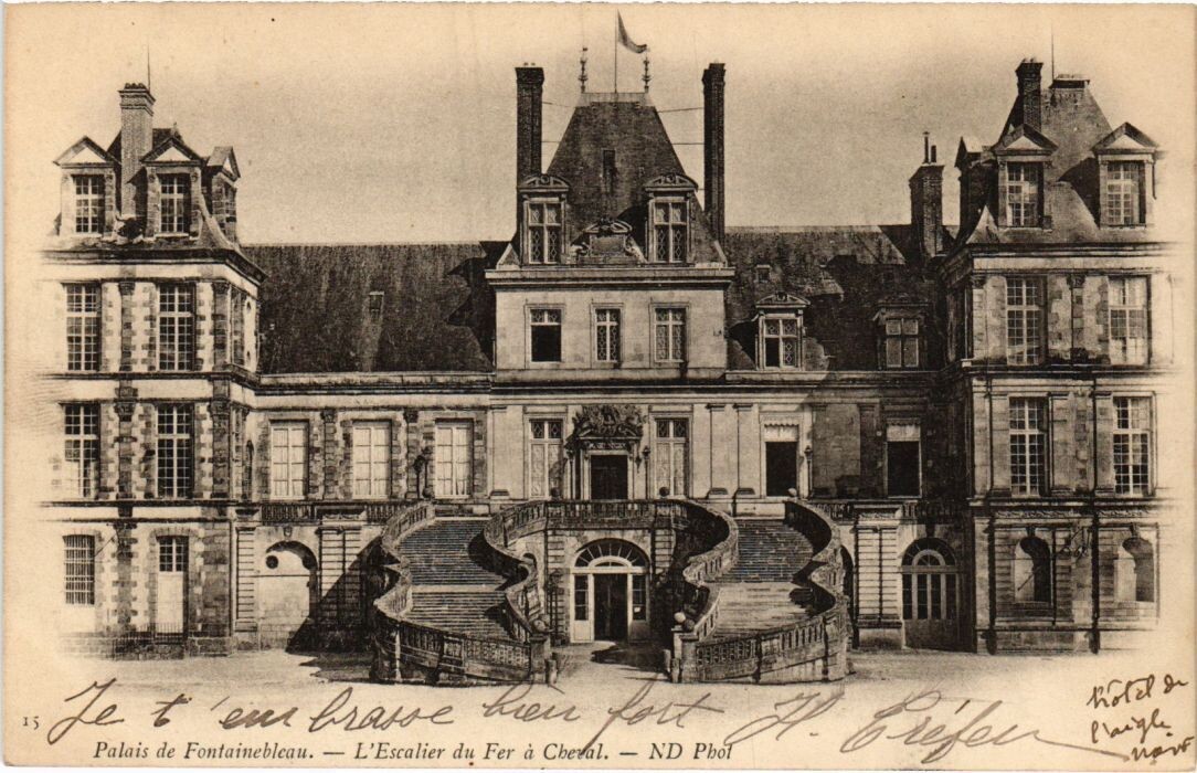Français : Carte postale, issue d'un tirage albuminé de format 21x27 cm, représentant l'escalier du Fer-à-Cheval du château de Fontainebleau.