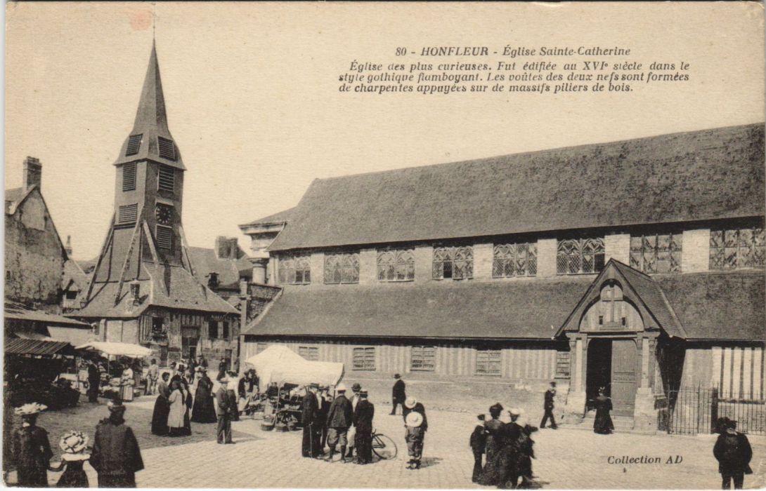 Version 3 : 80 HONFLEUR Eglise Sainte-Catherine Eglise des plus curieuses Fut edifiée Uu XVI stècle dans le styte golhique flanboyant. Les voûtes des deux 4e bois sont formces de charpentes appuyées sur de masstfs piliers de Collection AD