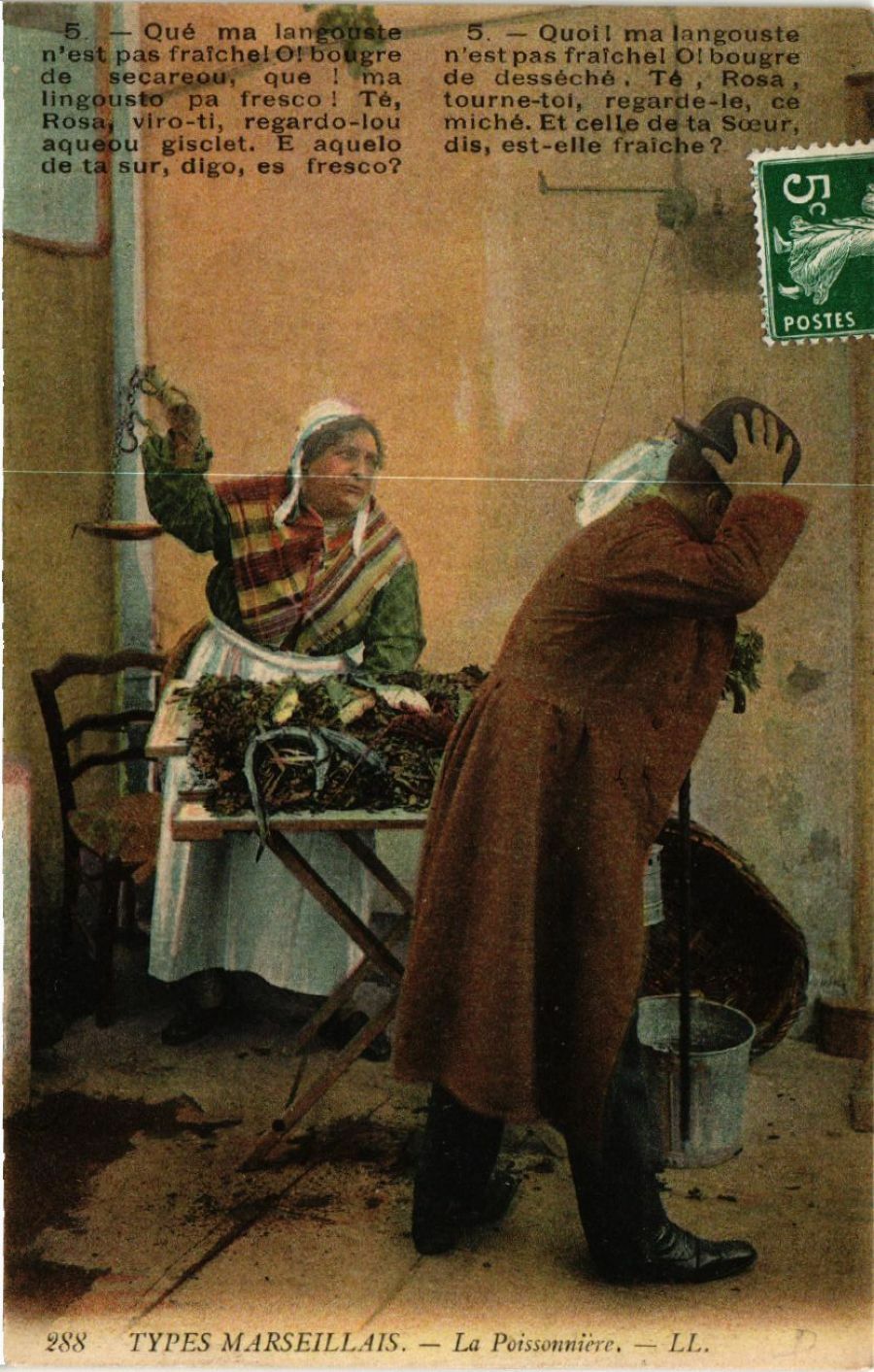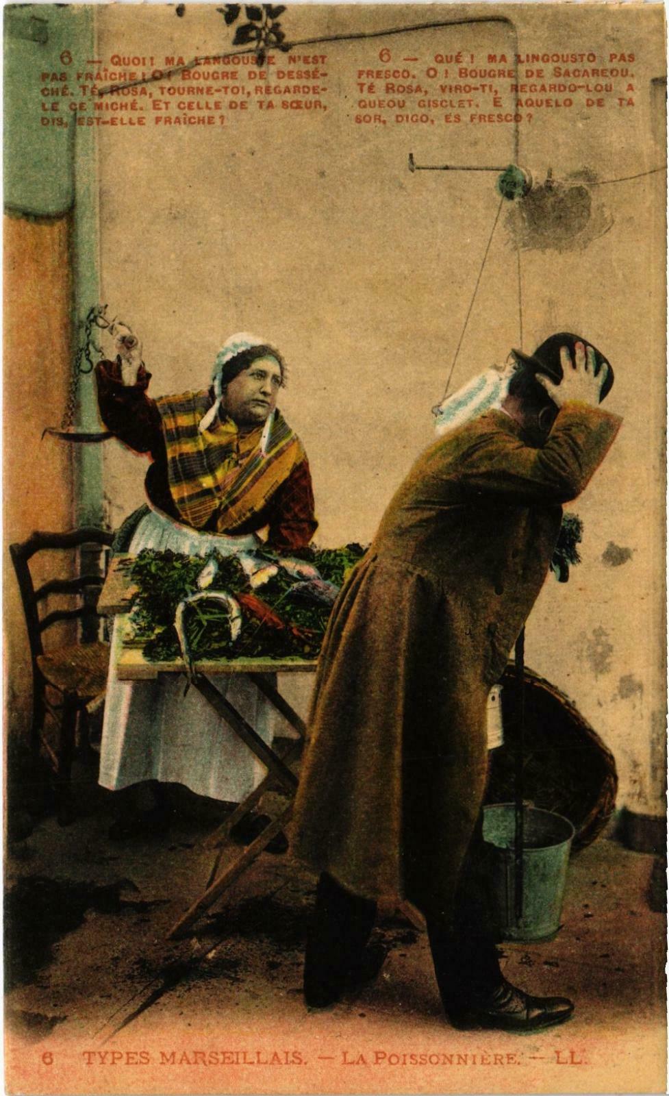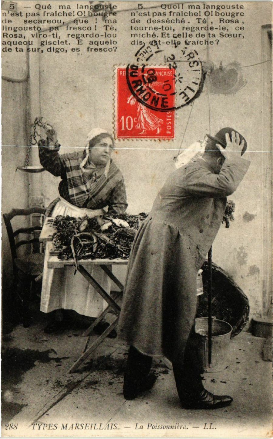 Version 3 : Qué ma langouste Quoi l ma langouste n'est pas fralchel 0l bougre n'est pas fraichel Olbougre de secareou, que ma de desseche Te Rosa Iingousto pa fresco Te tourne-toi, regarde-le, ce Rosa regardo-lou miché. Et celle de ta Soeur, aqueou wirosciet' aquelo dis, est-elle fraîche ? de ta sur, dlgo, es fresco? 288 TYPES MARSEILLAIS . La Poissonniere. LL.