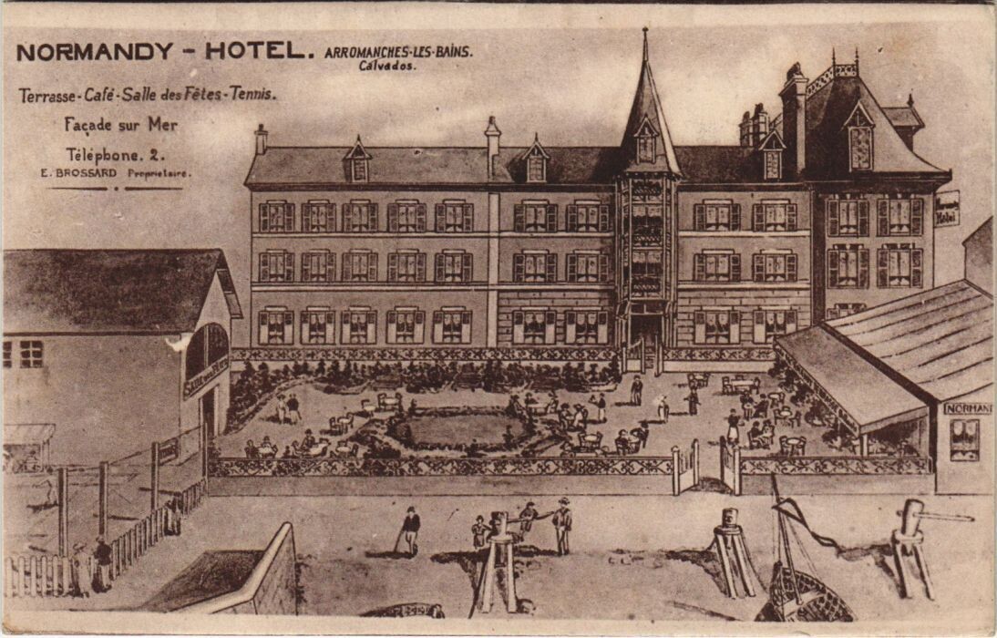 Version 2 : NORMANDY - HOTEL. ARROMANCHES LES BAINS. Terrasse- Café -Salle des Fêtes - Tennis. Façade sur Mer 4 Téléphone. 2. E-BROSSARD Preprelaire.