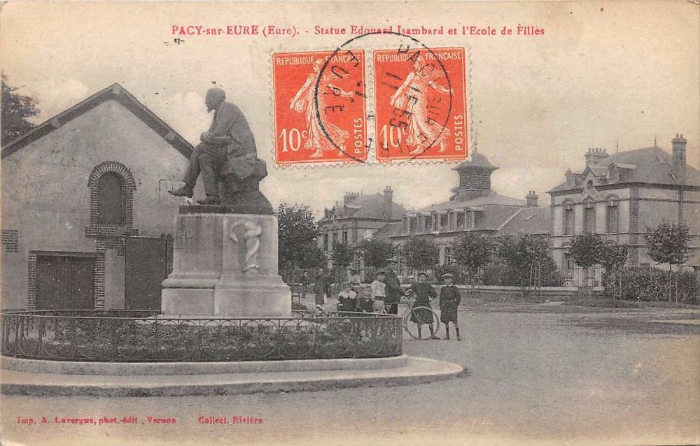Version 2 : PACY-sor-EURE (Eure). - Statue Edouard Tembord et l'Ecole de Filles + “Tmp, K.Lavegne, phat-éûit Varaon * Coltéet, Rivitro