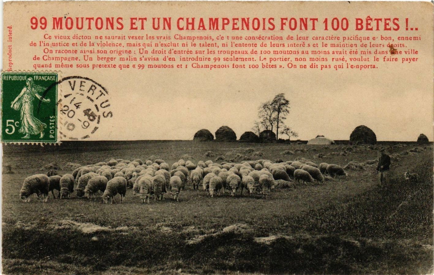 Version 3 : 99 MOUTONS ET UN CHAMPENOIS FONT 100 BETES ! Ce vieux dicion Fe SUral Vexer les vrais Chamrenois; 'est unsconsecratios de leur caractere Pacifique et bon ennemi de Vnjustice et de la violen:e, n.s exclut ni le lalent, D1 Ventepte dE Jeurs interets nnle mainuen de leurs drous 1 On riconte Mnsi son 0,4ne Un drol entrée troupezurue 100 moutons qu moins avalt ete IiS dans une ville 1 de hamp'kne Un mlalln avisa d en introjuire ement non mo'ns ruse,voulut le tare paytr quand mene sous pre:exte 'que ( 99 moutons Ct un Champenois fonr 100 betes On ne Uat P4s 441 Femporta 4 1 qu1 Sur portier , eule berger Siisod L
