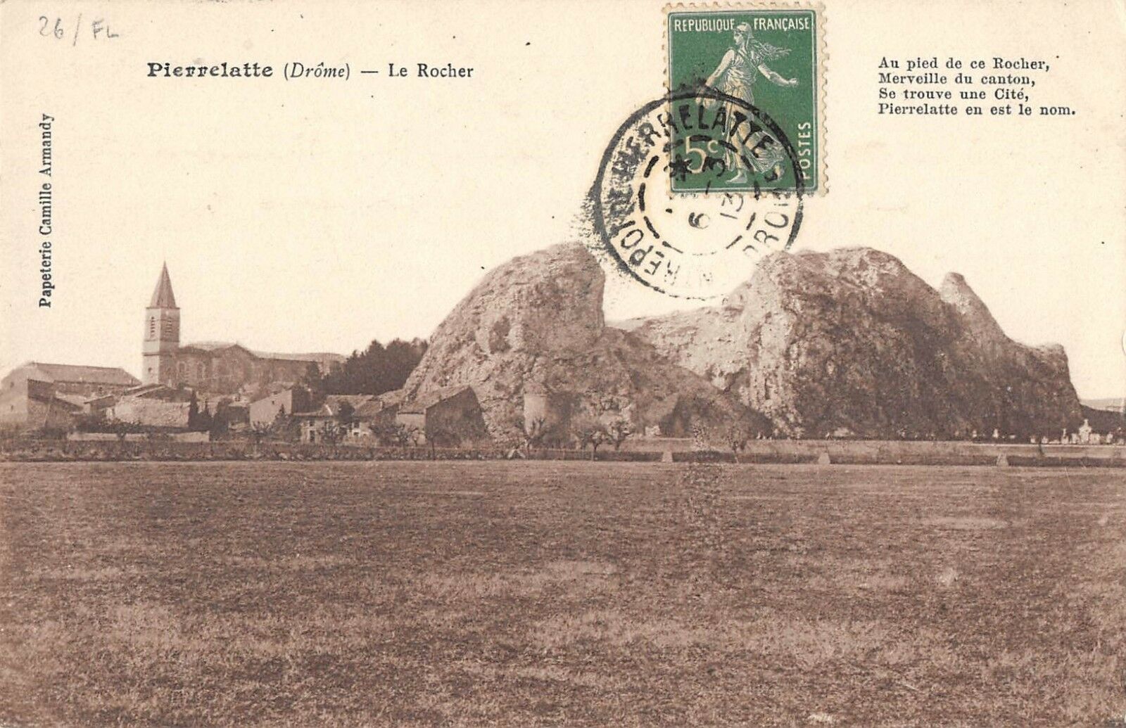 Version 3 : 26 FL REPUBUqUF FRANCAISE Pierrelatte (Drôme) Le Rocher Au de ce Rocher, Merveille du canton, Se trouve une Cité, Pierrelatte en est le nom, ELA 1 59 8 P @ 1 pied 2