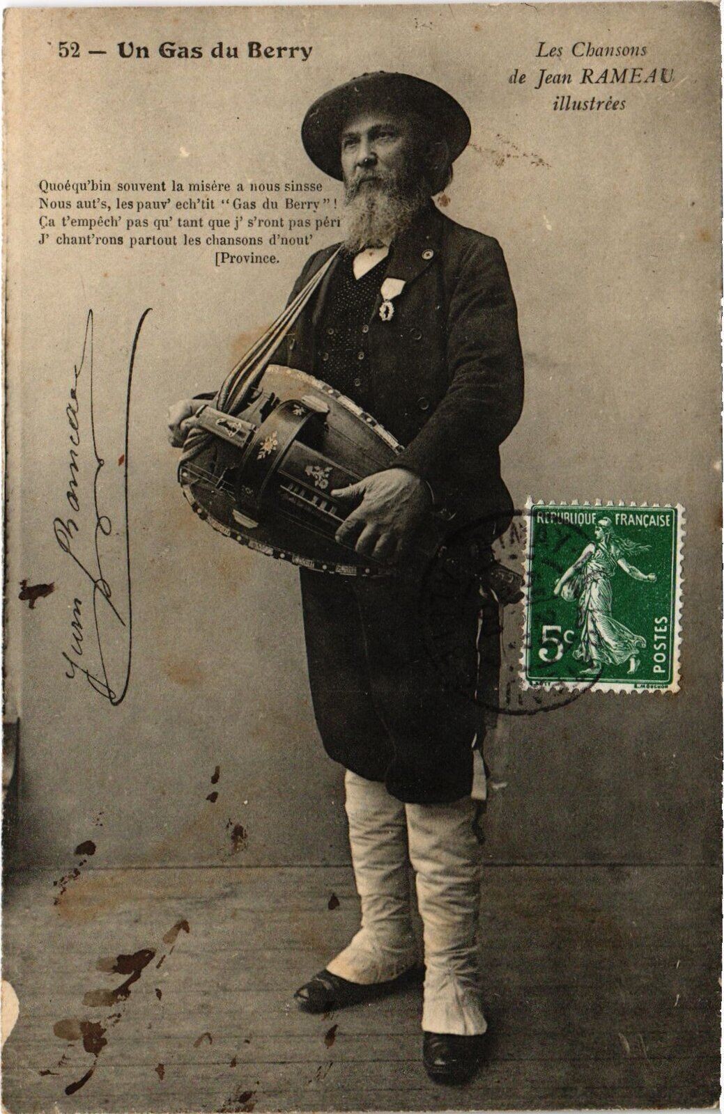 Version 2 : 52 — Un Gas du Berry Les Chansons de Jean RAMEAU illustrées Quoéqu'bin souvent la misère a nous sinsse Nous aut's, les pauv ech'tit ‘Gas du Berry! Ca t'empéch' pas qu' tant que j' s'ront pas péri J' chantrons partout les chansons d'nout' [Province.